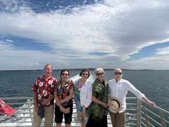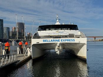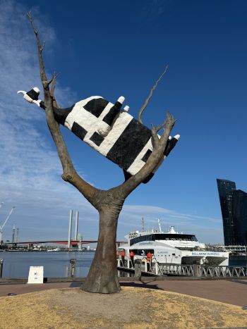 From John Kelly’s statue of the ‘cow up a tree’ on the Esplanade at Docklands [Is it really a Friesian cow?] to the catamaran that promises a short, safe voyage to Portarlington, the latest adventure for members promised excitement and, once again, great companionship.Leaving port and cruising down the river past Williamstown on our starboard side and a small colony of fur seals sunning on a yellow marker buoy off the port bow, we passed the former site of the Gellibrand Light and headed across the bay towards our lunch destination. Offshore from Altona and with the You Yangs rising to the south, Kim recalled her climbing the mountains with a group of friends some decades ago while the Bellarine Peninsula loomed closer to the south.